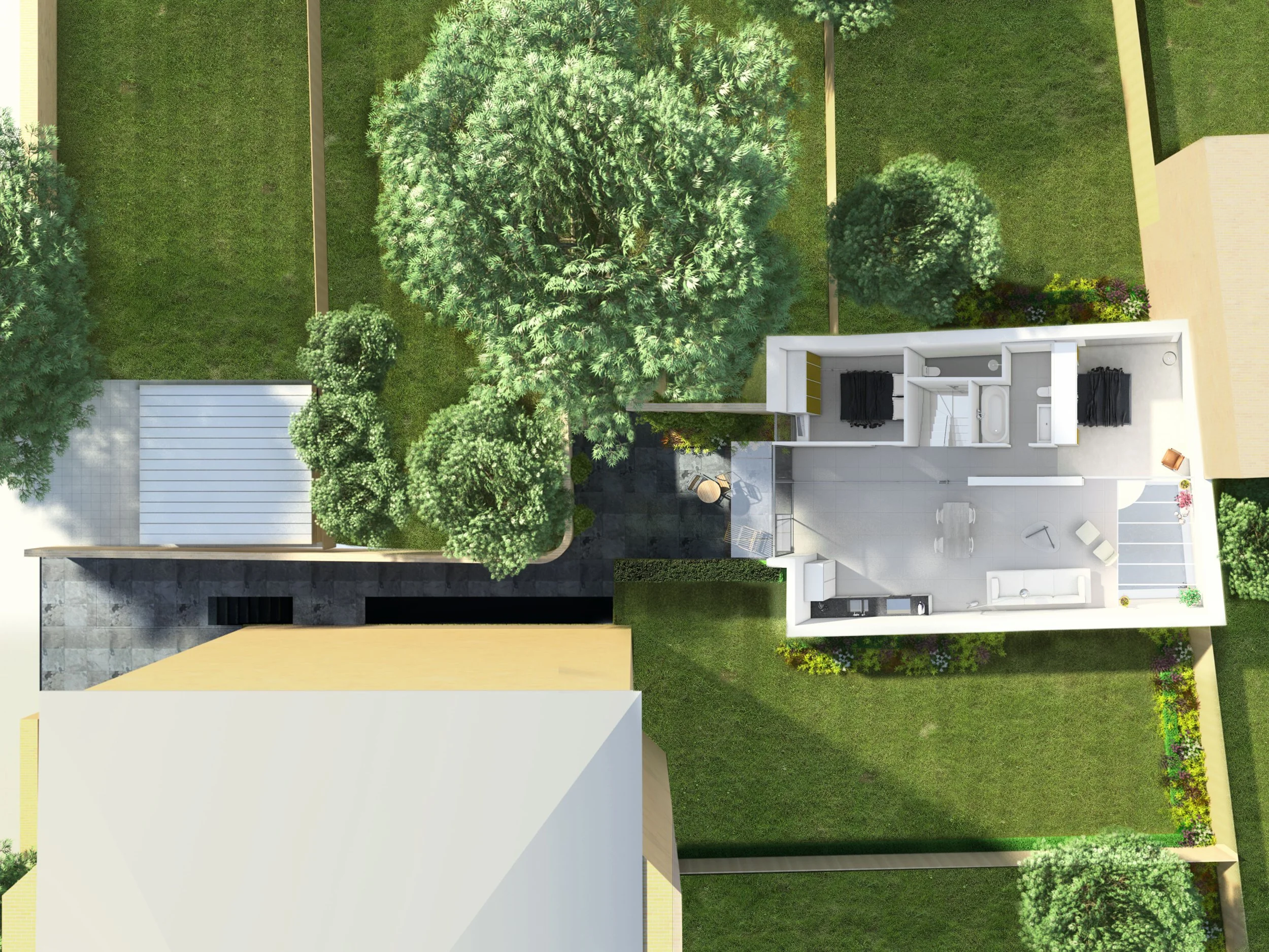 Planning Permission was assured by the siting of the main volume of the house substantially below ground level, with projection at ground level limited to the height of surrounding garden fences.