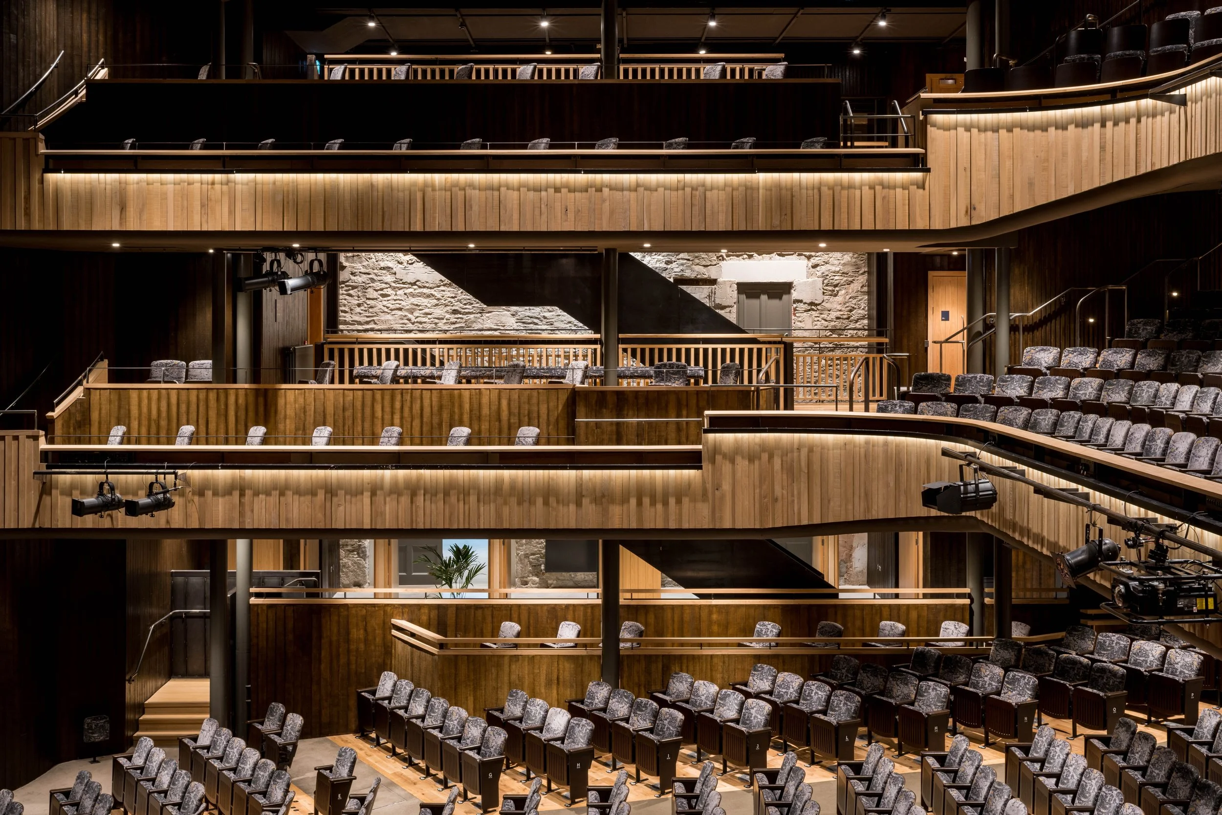 The project has stripped out the old arena style auditorium back to the bones. We inserted a new steel and timber frame across 3 levels, digging down for the stalls and popping up a roof extension. We installed a flexible proscenium and variable acoustic banners supporting a range of performance from orchestral to stand-up comedy.