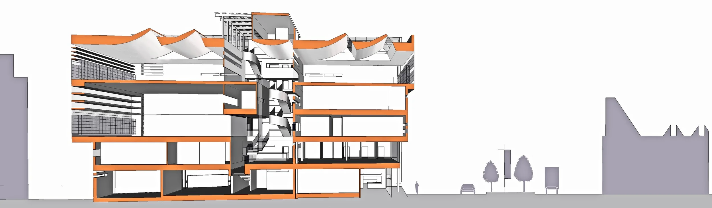 Burrell Foley Fischer was selected to participate in a limited competition for the design of a new home for Rambert Dance on an enclosed, deep plan site in London, immediately behind the National Theatre. The number and size of dance studios required and the constraints on the delivery of large articulated touring vehicles made the layout of the building particularly challenging.