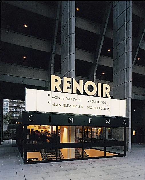 The strong graphic identity for the Renoir is used to mark the entrance through a Miesian box on the forecourt to the Brunswick Centre.