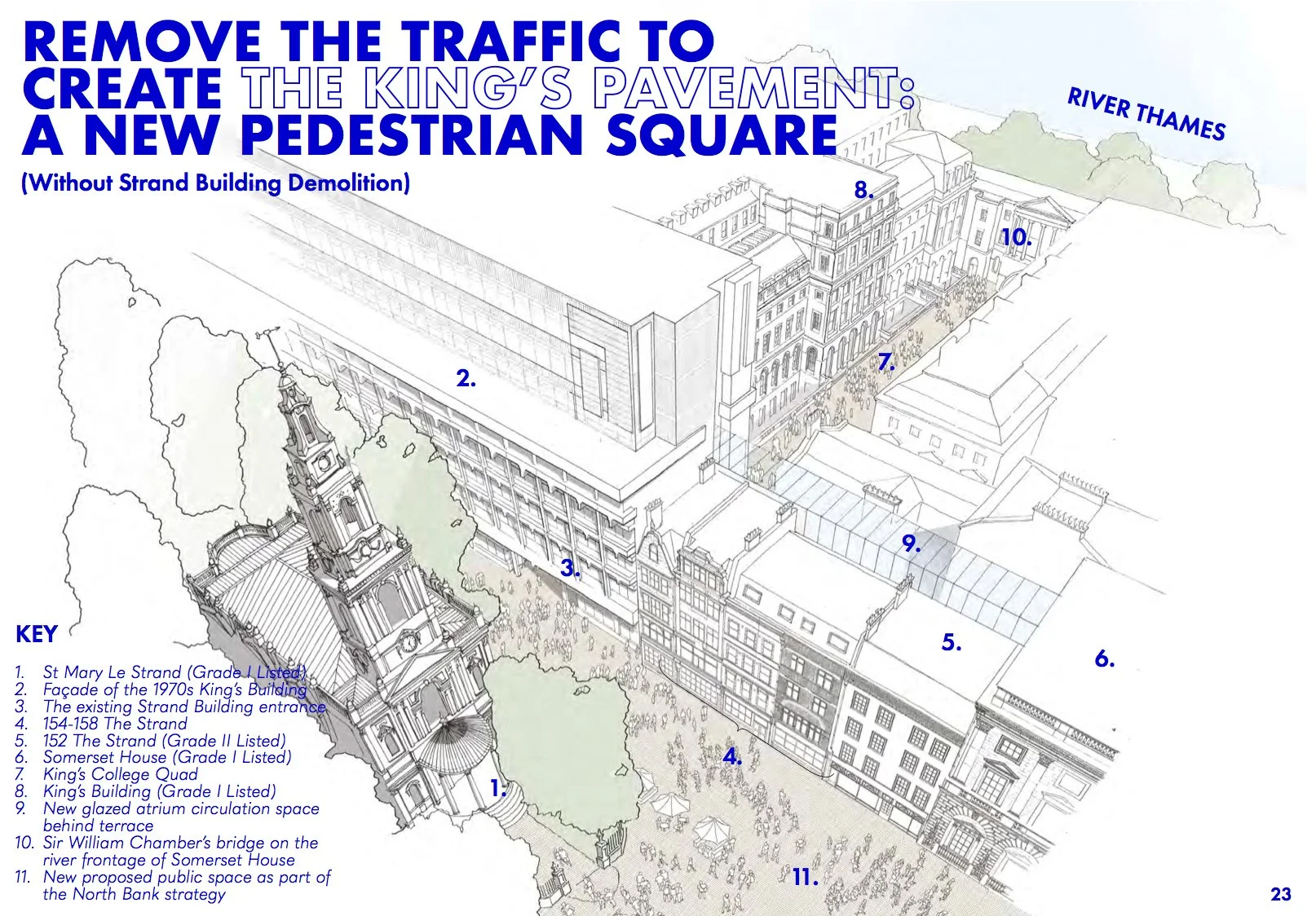 Following the public furore over the proposed demolition of 154-158 the Strand and façading of 152-153, by King’s College, Burrell Foley Fischer were appointed by Save Britain’s Heritage to propose alternative solution. John Burrell suggested it opens an opportunity to create a magnificent new piece of public realm for the capital halfway along the great processional route to and from Westminster and Buckingham Palace to St Paul’s Cathedral and the City.
